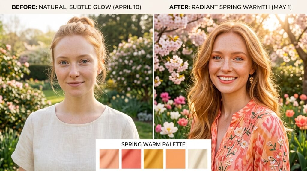 • Весна: Теплий підтон + середній/низький контраст, світлий
