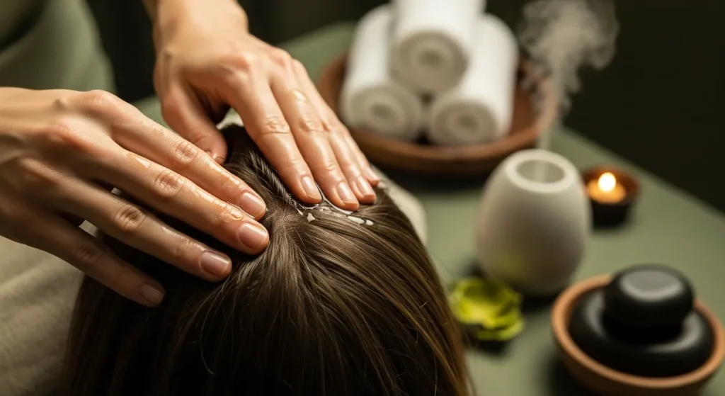 Почніть з кінчиків пальців. Круговими рухами масуйте скроні 1 хв. Перейдіть до потилиці. Тисніть легко, без болю. Закінчіть чолом. Це зменшує випадіння на 10-15%.